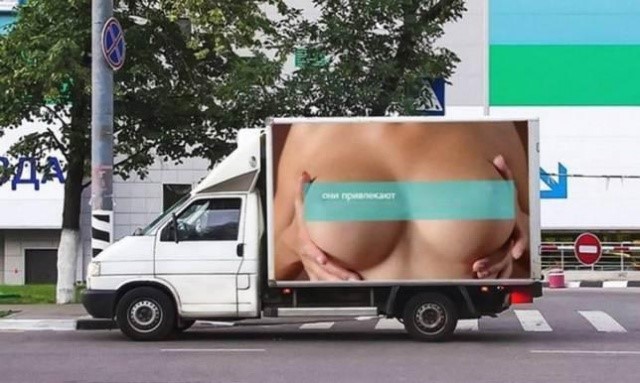 Áno, boli to prsia. V Moskve v ten deň totiž jazdilo 30 nákladiakov, ktoré mali na boku veľkú reklamu. Tá spôsobila, že sa vodiči nevenovali riadeniu, ale „čumeli“ na veľké ženské prednosti. Samozrejme, časť z nich to neustála a nabúrala. Až po množstve telefonátov zasiahla dopravná polícia, ktorá až do odvolania stiahla všetky vozidlá s reklamou z ciest, a tak zabránila dopravnej a poisťovacej katastrofe. Či si môžu poisťovne žiadať náhradu za vyplatené škody od reklamnej agentúry, ktorá dodávky do mestských ulíc vyslala, mi nie je známe, ale na moskovských cestách sa reklama už neobjavila.