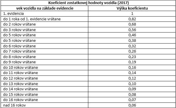 - veku vozidla (koeficient zostatkovej hodnoty vozidla)