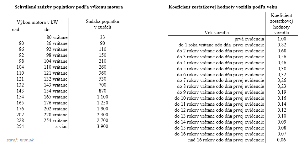 kde je RP – výška poplatku, PkW – sadzba poplatku za 1. prihlásenie/zápis vozidla a RV1-n – koeficient zostatkovej hodnoty (podľa veku vozidla odo dňa jeho 1. prihlásenia/zápisu)